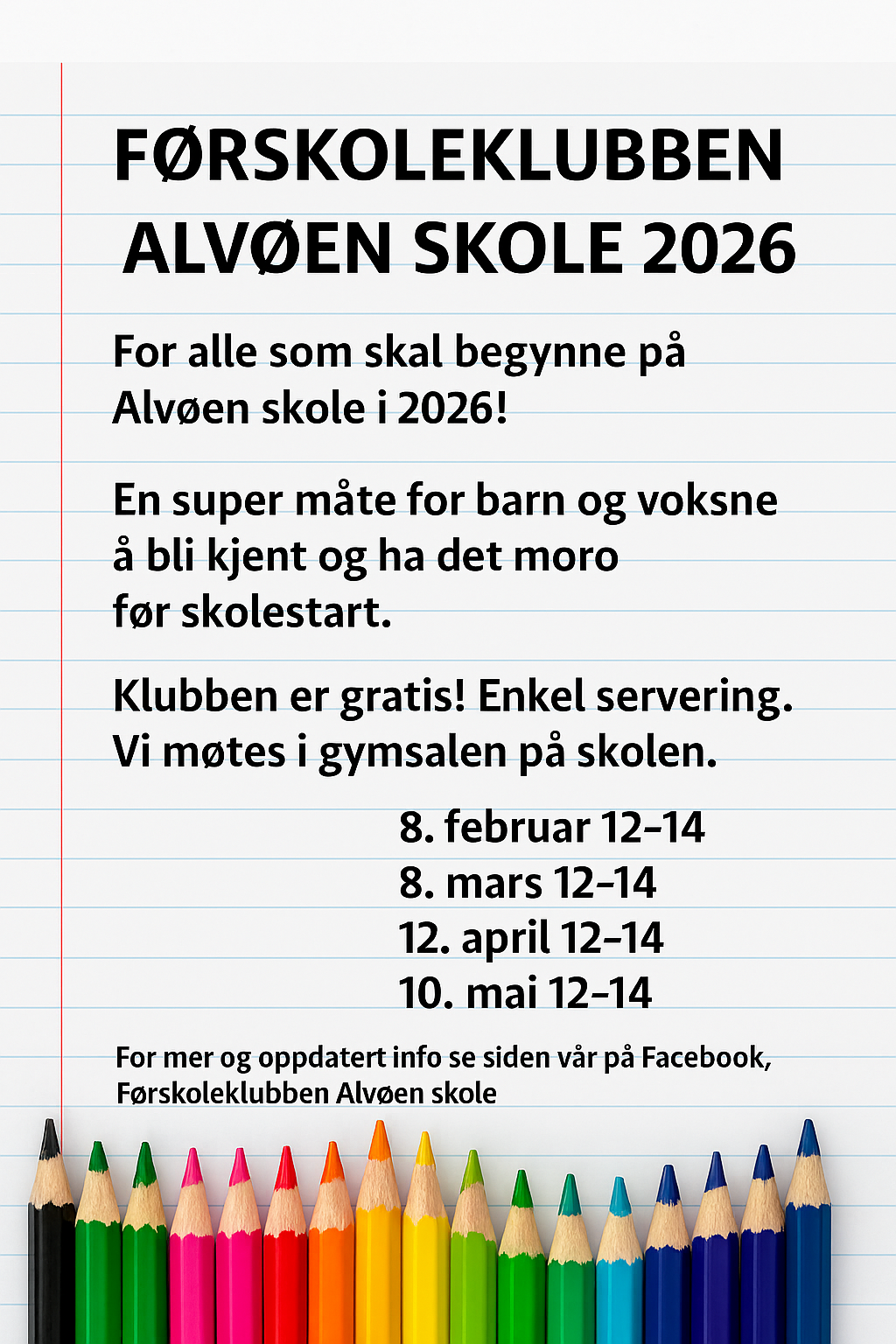 - Foreldremøte: 28. april 2026 - kl. 17.30-19.00 (i skolens gymsal)