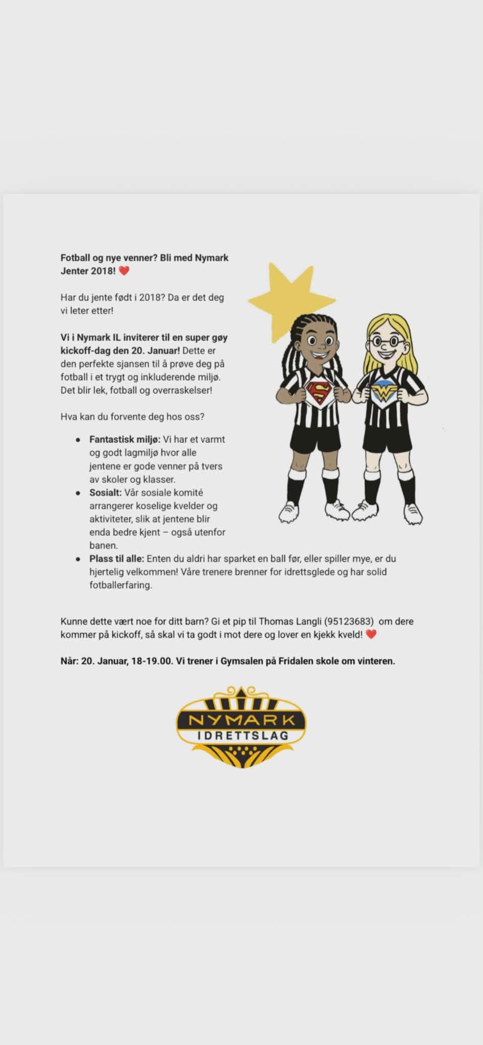 Nymark IL inviterer alle jenter født i 2018 til fotballtrening på Fridalen skole hver tirsdag mellom klokken 18:00 og 19:00.
