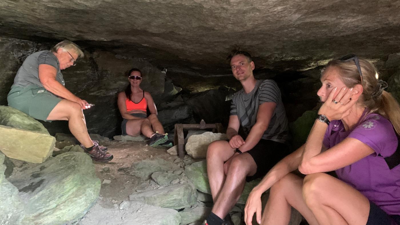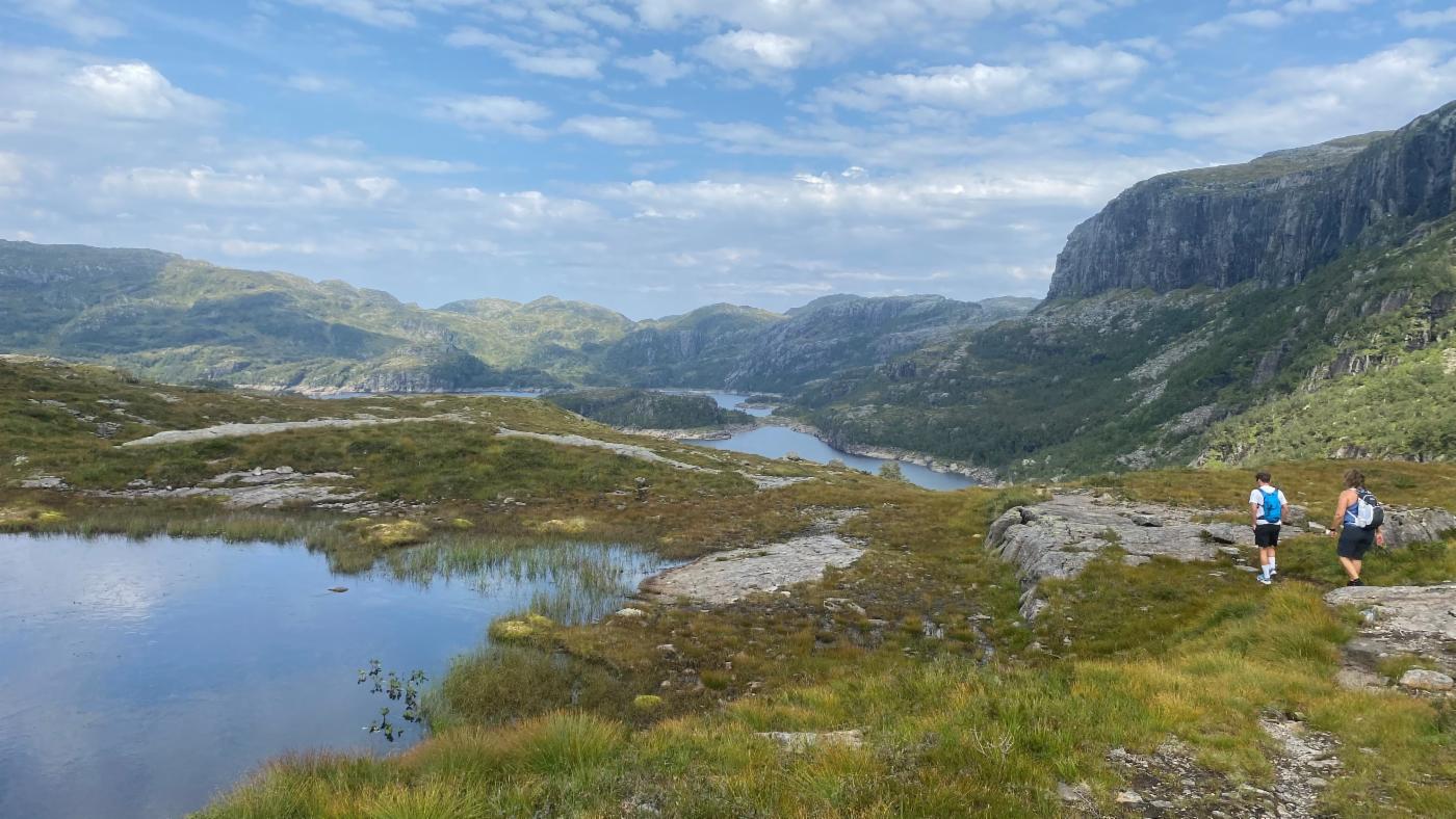Etter lunsj ble det fjelltur i strålende vær mot Botnavatnet og lagerplassen i Storura der vi fremdeles ser rester etter containerne. I tillegg til Per Helge var vi så heldige å ha med etterkommere av slippgjengen med Hålandsdøl Jan Solvang i bresjen. Disse bidro med informasjon og anekdoter som de selv har blitt fortalt fra fedre eller nære slektninger som var med i det lokale motstandsarbeidet under krigen.