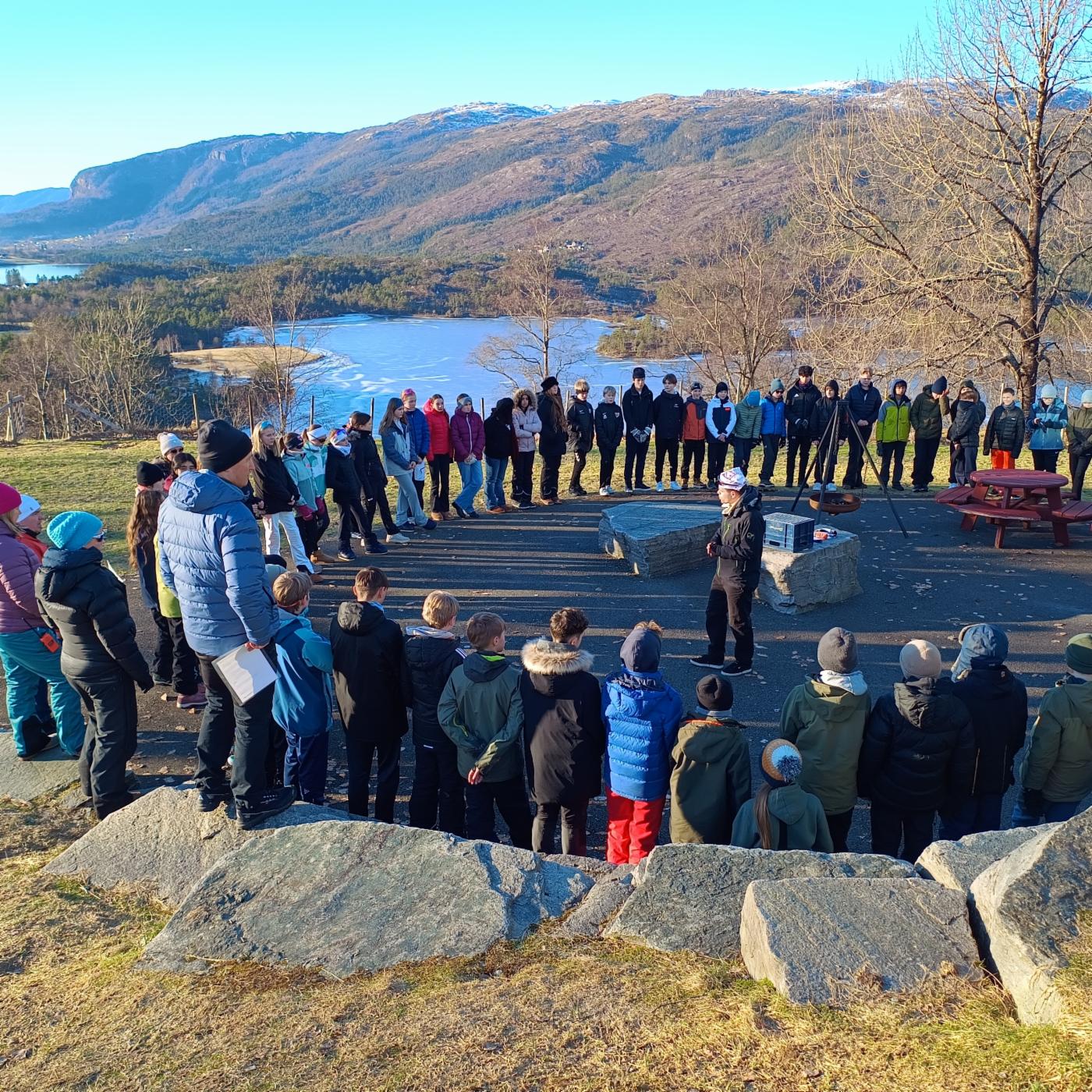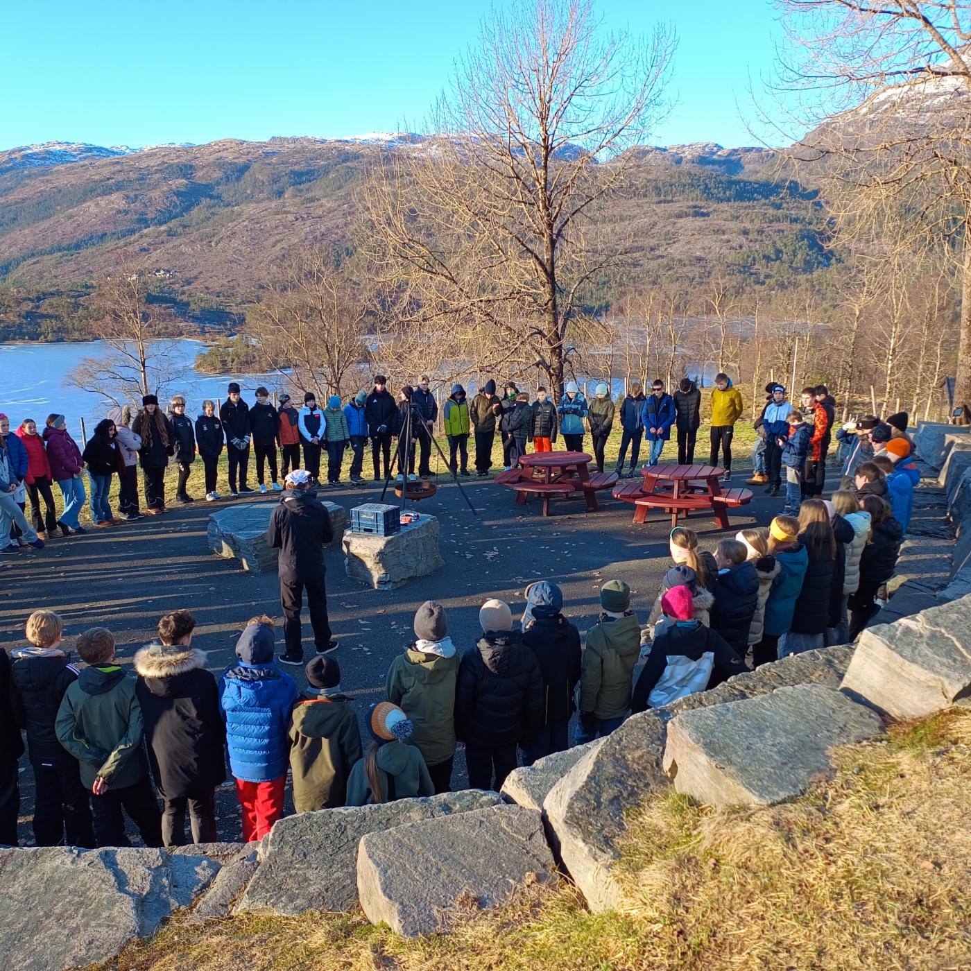 En glad, men spent gjeng satt seg på bussen mandag morgen, klar for en uke på Hålandsdalen leirskole. Mange spente barn på bussen. Etter en lang busstur for noen, og for kort for noen andre, kom vi frem til Hålandsdalen leirskole i nydelig, men kaldt vær. Etter å ha lagt på sengene, pakket ut, og spist veldig god lunsj, var det tid for samarbeidsøvelser på tvers av skolene. Mange gode forslag for å løse oppgavene gruppene ble stilt ovenfor, og kjekt å se hvor fort elevene ble kjent på tvers av skolene. I kveld har det blitt lekt tikken, spilt basket- og fotball, ulike kortspill og vært mye smil og latter. I morgen er vi klar for en dag ute, i nydelig natur.