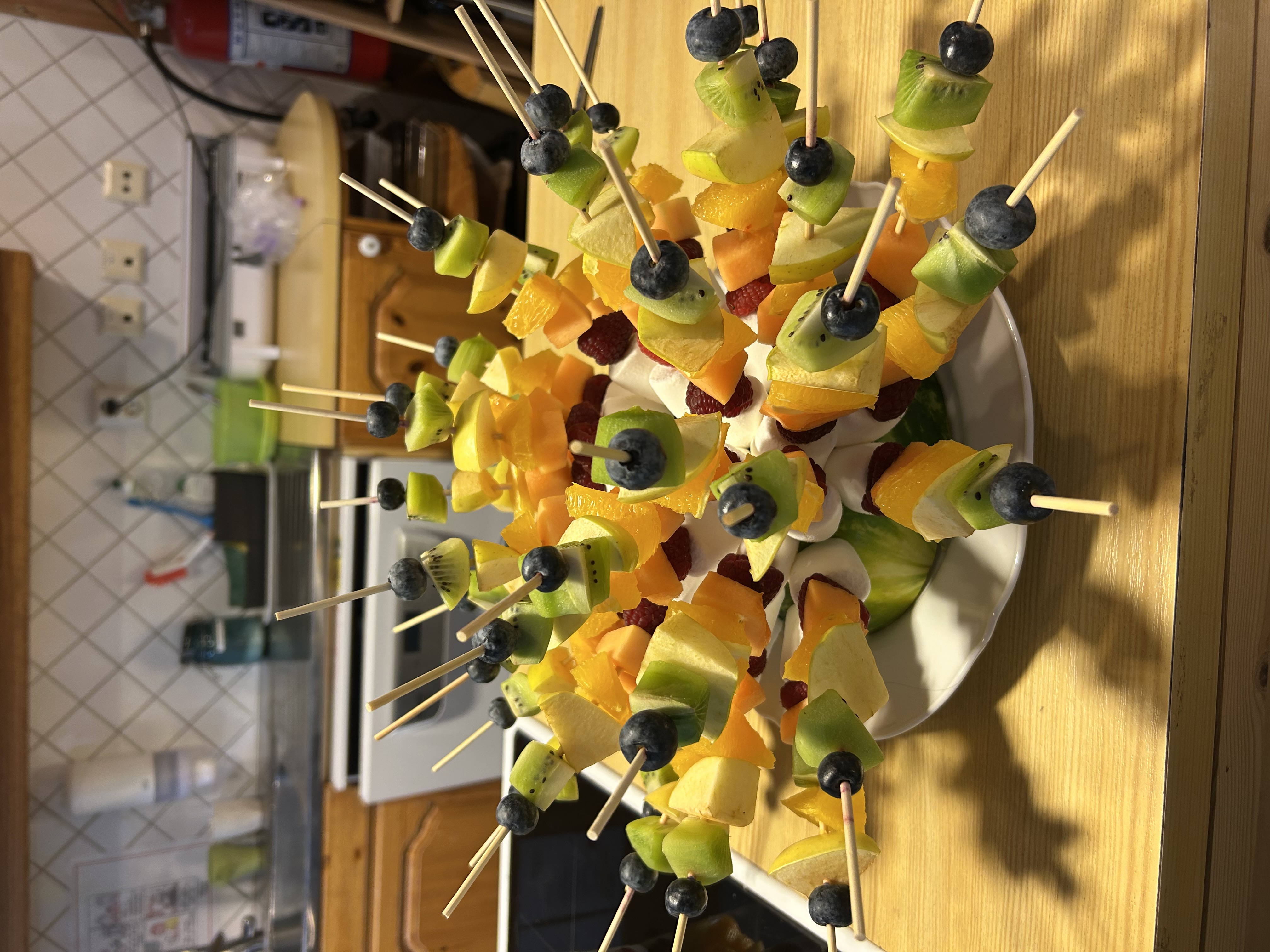Det ble dekket langbord og servert fruktspyd, popcorn og saft.
