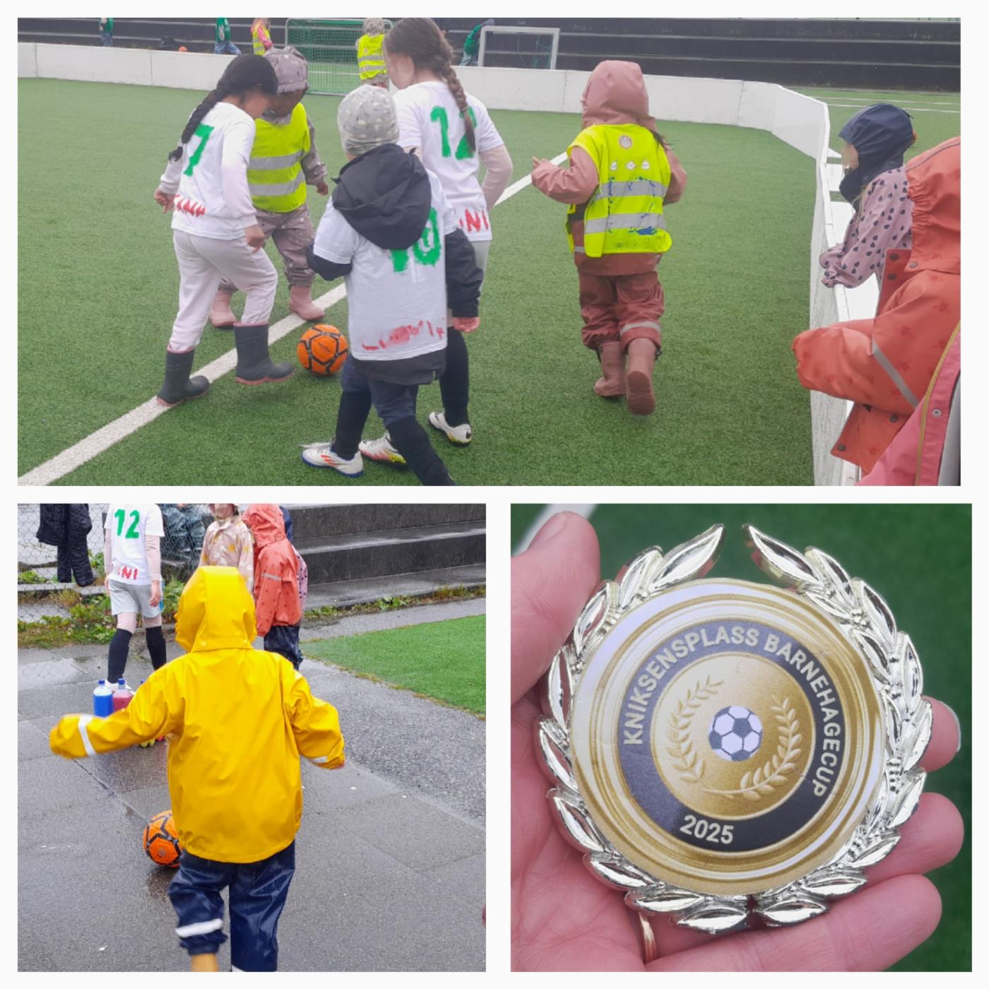 Hele barnehagen har vært i sving for å få dette til og vi har også hatt ressurspersoner fra de andre barnehagene som har bidratt i planleggingen. På forhånd laget førskolebarna sine egne fotballdrakter og heiagjengen laget plakater. Det ble et vellykket arrangement og stemningen var god til tross for det dårlige været.