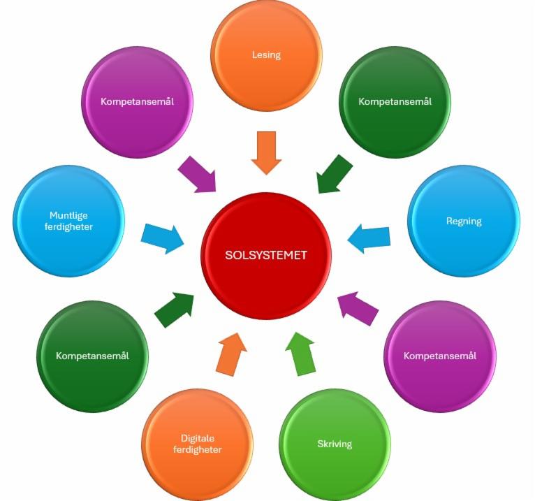 På denne måten vil vi kunne jobbe med alle de grunnleggende ferdighetene og fagene innenfor store temaer over tid, slik figuren til høyre viser. Slik kan vi sikre oss at elevene utvikler en dypere kompetanse og ser sammenhenger på tvers av de ulike fagene. Som rektor har jeg også stor tro på at dette vil skape en mye mer inkluderende undervisning, da det er lett å finne temaer som kan engasjere mange av elevene våre - på ulike måter.