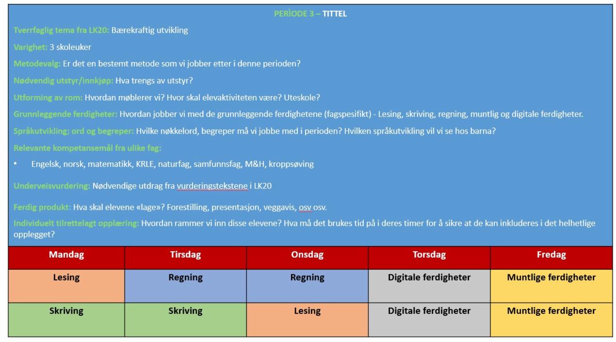 Under kan dere se en skisse over alt det som vi voksne jobber med i forberedelsen av de ulike temaperiodene. Vi ser også for oss at temaperiodene skal vare lengre og romme mer enn disse tre ukene som første prøveperiode gjør, men vi må bygge dette sammen over de neste årene.