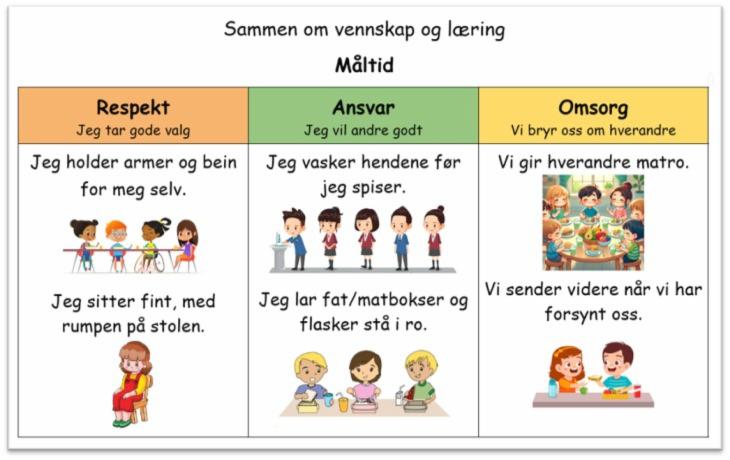 I PALS-modellen jobber vi med svært mange sider av skolemiljøet vårt. Et av de viktigste prinsippene er at vi øver mye på ulike positive forventninger. Under ser dere et eksempel på en forventningsmatrise fra vår SFO hvor de jobber med måltidene. Vi øver inn tilsvarende matriser på mange andre av skolens områder (klasserom, ganger, toaletter, uteområder, fellessamlinger, toaletter osv). Det ligger et grunnleggende positivt elevsyn i dette arbeidet, hvor fokuset er på at vi blir bedre på ting hvis vi øver - og at problematisk atferd kan oppstå mest fordi elevene ikke helt vet hva som er forventet av dem.