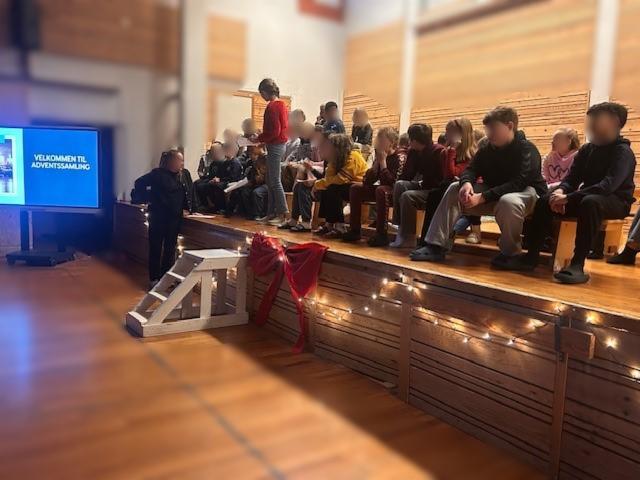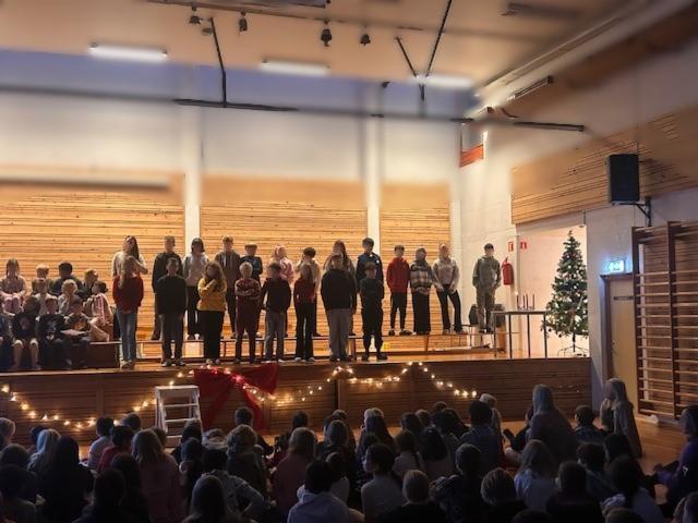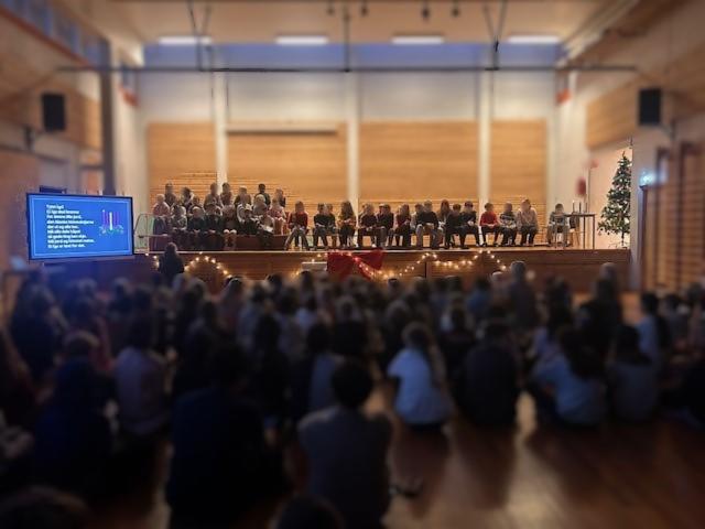 Hele skolen sang *Rudolf er rød på nesen* sammen.
