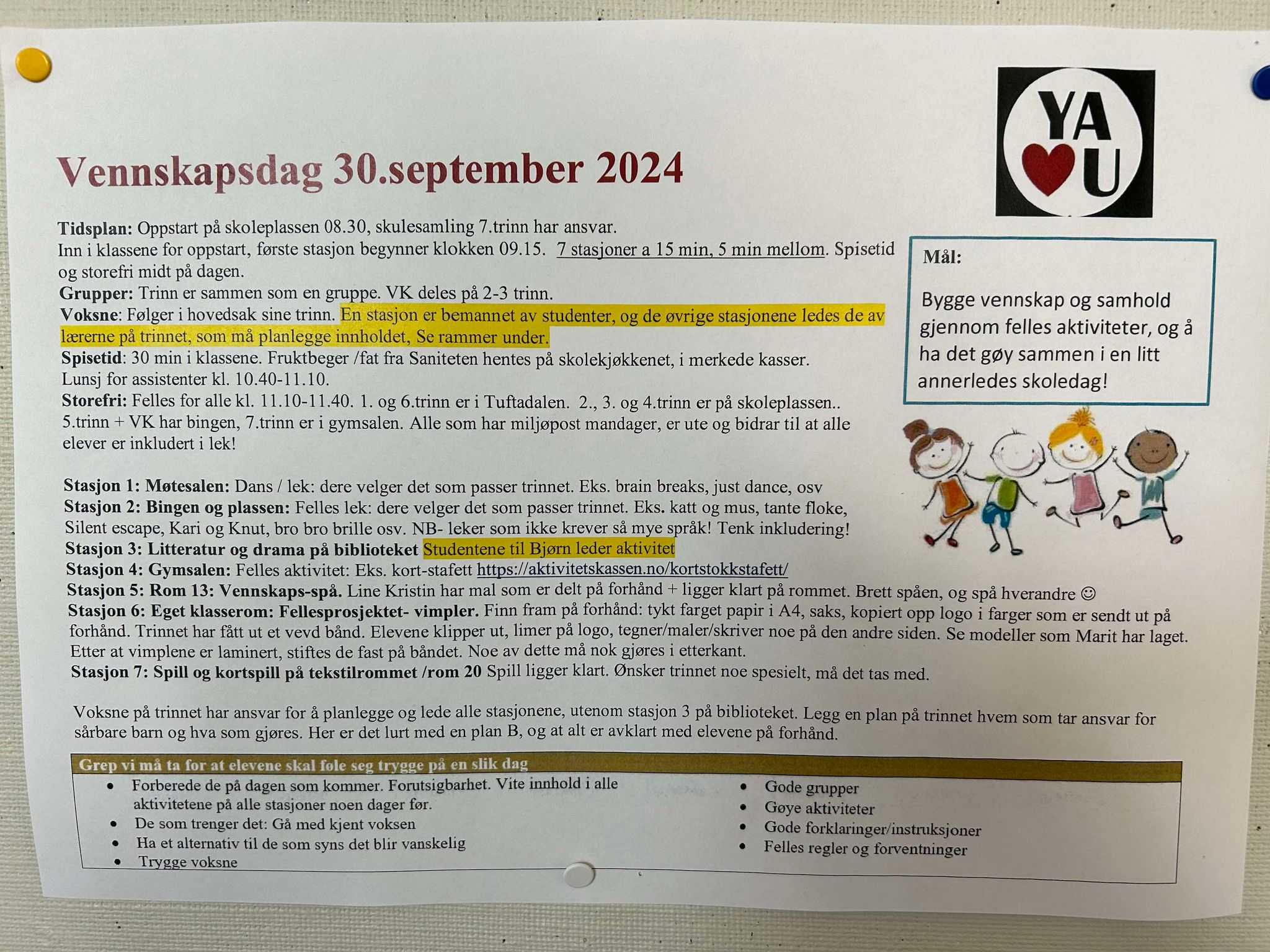 Før haustferien kvart år har vi ein venskapsdag, der vi har kjekke aktivitetar felles for alle. I år hadde vi denne dagen både skulesamling ute og 7 kjekke stasjonar med leik og aktivitet.