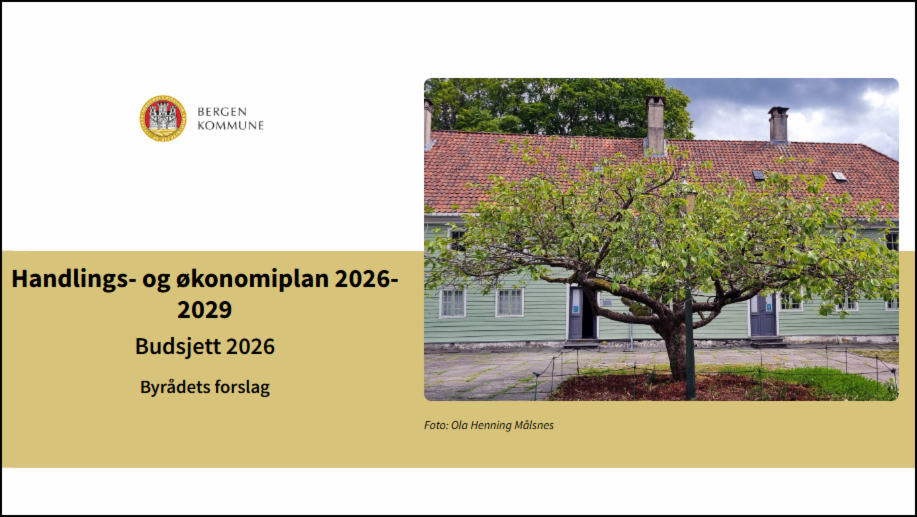 - Skal behandle byrådets forslag til bybudsjett 2026 og handlings- og økonomiplan 2026-2029. All informasjon om budsjettet er samlet på en egen side: bergen.kommune.no/budsjett